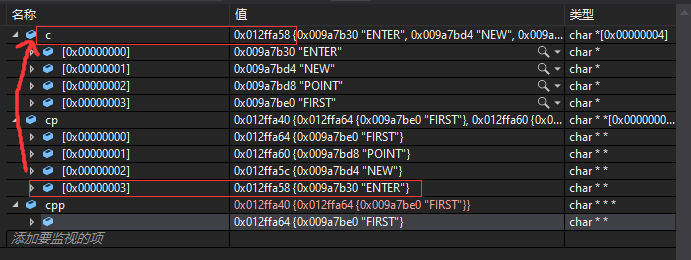 第二个printf,因为++优先级比较高,所以cpp再向下跳,再解引用,找到c+1的空间,然后再--,相当于c+1-1,导致该空间指向了c+0,也就是上面这个监视图所指向的地址。也就是改变了指向的空间,再解引用找到了指向ENTER的空间,也就是ENTER的首地址,再进行加3,跳过E,N,T,找到ER。