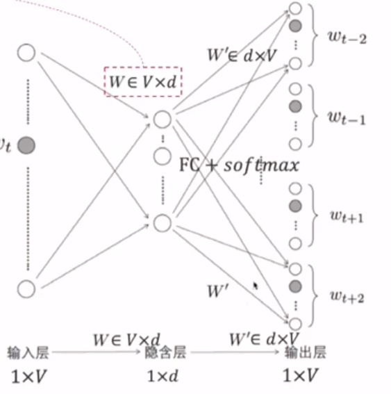 个人理解:embedding矩阵W中包含着词与词之间的关系系数,与某个词的one-hot编码相乘后得到这个词与其他词的关系系数;分类矩阵W'的作用是通过关系系数向量得到每个位置上每个词的概率。