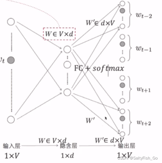 给定中间词,来预测上下文窗口中的词: 选定一个词,用one-hot向量乘Embedding矩阵,可以得到唯一不为0的 词向量(包含本词和其他词之间的关系);再乘一个分类矩阵W', 得到每个位置上每个词的权重,最后softmax概率映射函数,就得到每个位置上每个词的预测概率。