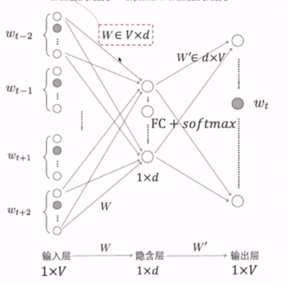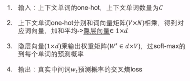 窗口内C个上下文单词的one-hot乘Embedding矩阵,得到C个词向量,将这些词向量meanpooling,取得加和平均(包含上下文词的平均相关系数信息),再乘个分类矩阵W'然后softmax(得到每个词的概率)。取最大概率的中间词。