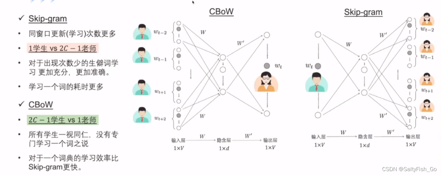 cbow是一个老师教2C-1个学生,效率更高,能更快的达到平均水平