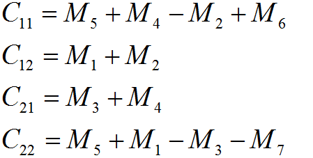 然而这样并没有减少乘法次数,时间复杂度木有降低。所以有Strassen改进: