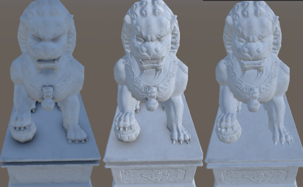 可见,使用了AO贴图后,在小狮子的眼窝,嘴巴,爪子下,接缝,球底等部分环境光都降低了,使狮子的细节表现更加丰富,而最右侧的无AO贴图的效果则整体光照效果偏平,没有过渡。