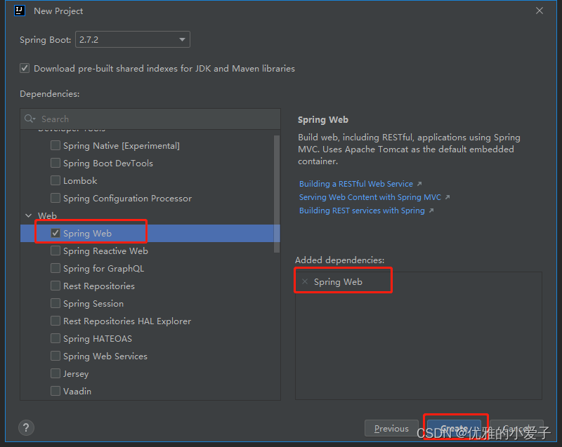 四、点击下一步,选择Web下的SpringWeb,点击create即创建成功。