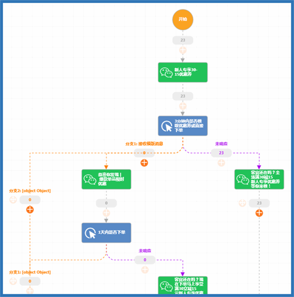 对于已经获取初步分值的目标群体,需要进行进一步的培育转化。市场团队可以通过营销自动化平台创建客户培育流程,引导线索从早期阶段到兴趣到购买转化阶段,并且在交互流程中对目标群体进行再打分和再培育。例如某电商品牌在亿业平台上搭建的线索培育流程图如下: