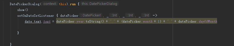 就在我差点放弃的时候,我突然想起java语言开发的时候在acitvity中弹出dialog,引用dialog控件会在控件前面加一个dialog,于是我在想我这里弹出一个dialog,然后直接引用的activity控件,是不是这里面有什么问题?(备注:正常情况是没问题的)。接着我就把date_text这个控件初始化了一下