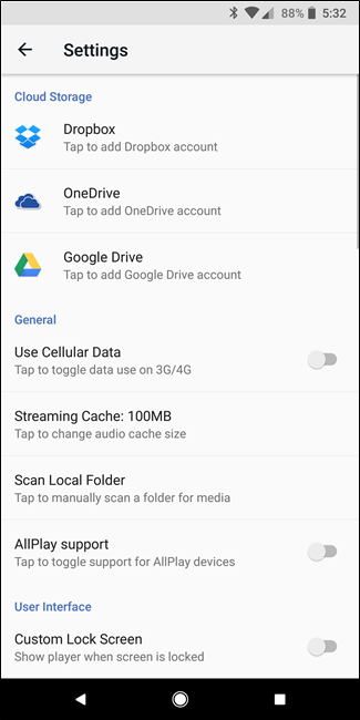Okay, this one may be stretching the “local music” thing just a bit, but if you prefer to keep your music stored in Dropbox, Google Drive, or OneDrive, there’s no reason you shouldn’t be able to stream it directly from those places. That’s sort of the best of both worlds: you can define the format and bitrate of your tunes, keep the storage on your device from getting filled too quickly, and not have to spend the cash on a streaming music package.