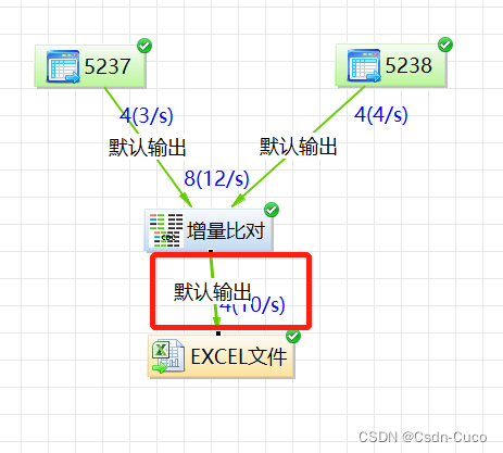 七、从数据转换里拖出增量比对组件,用绿色的线连接,进行配置,如图: