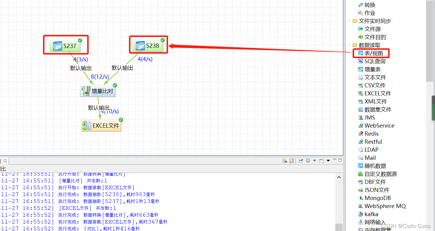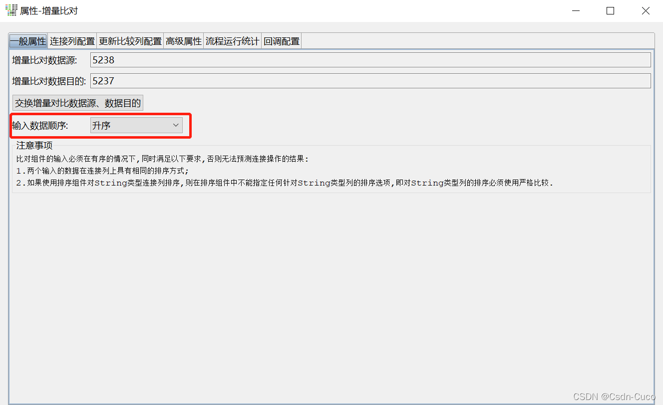 注意:源表对应增量比对数据源,目的表对应增量比对数据目的,数据输入顺序要和上面表读取组件的排序规则一致,都选择升序
