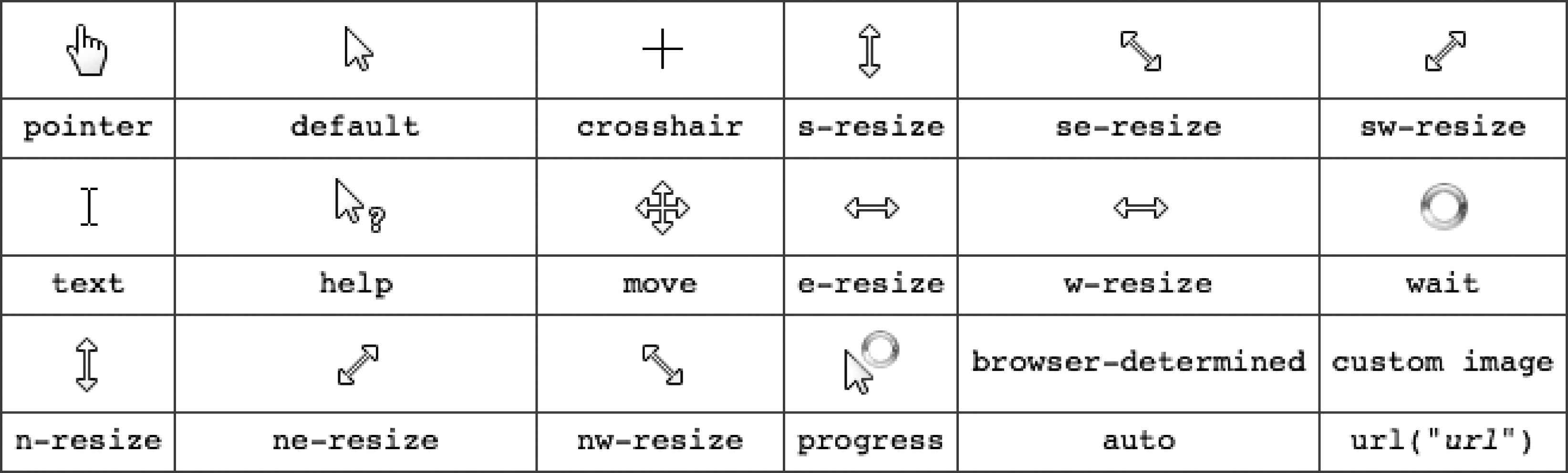 1.CSS还可以设置鼠标悬停在元素上时的不同光标样式。cursor属性用于设置鼠标的光标样式,即当鼠标悬停在元素上时,可改变鼠标光标的显示样式。其取值如图5-17所示。