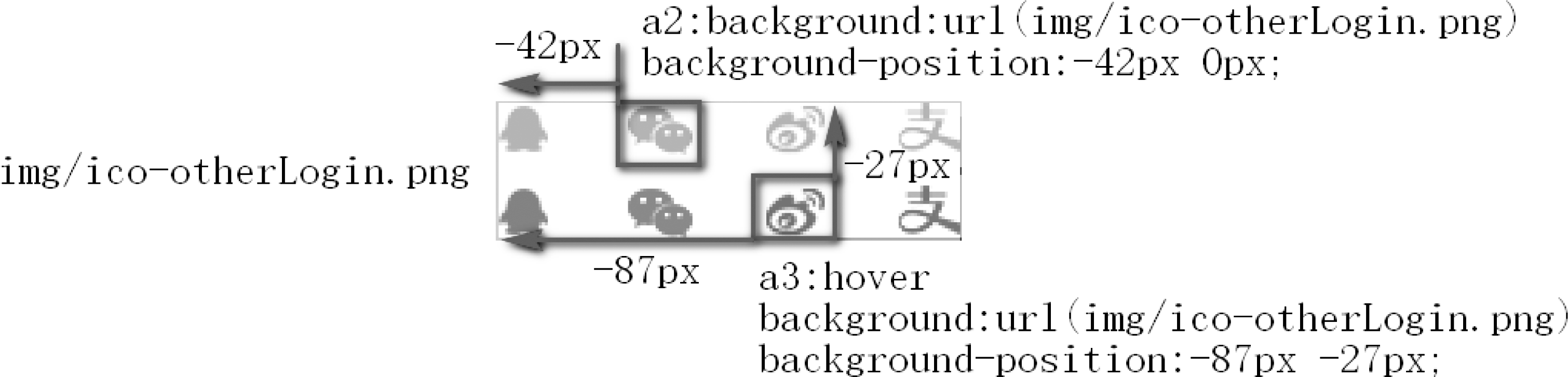 为了避免网页加载时多次下载每张小图片,减少请求次数,我们在设计图标时,就先将小图标整齐地排列在一张大图片文件内,如图5-29所示。然后,仅请求一次大图片,即可获取所有小图标。而使用时,再根据小图标在大图片中的位置,通过调整元素背景的位置来选择对应的小图片作为背景。这种优化技巧称为CSS精灵(CSS Sprite)。