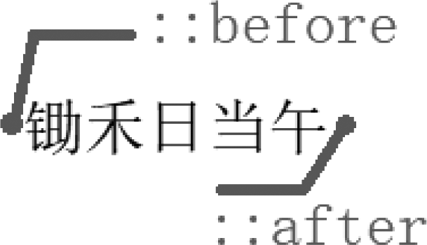 (2) :after或::after,用于匹配某元素内容区域结尾的位置。例如,<p>锄禾日当午</p>中,“午”字之后看不见的位置,就是::after表示的位置,如图5-39所示。