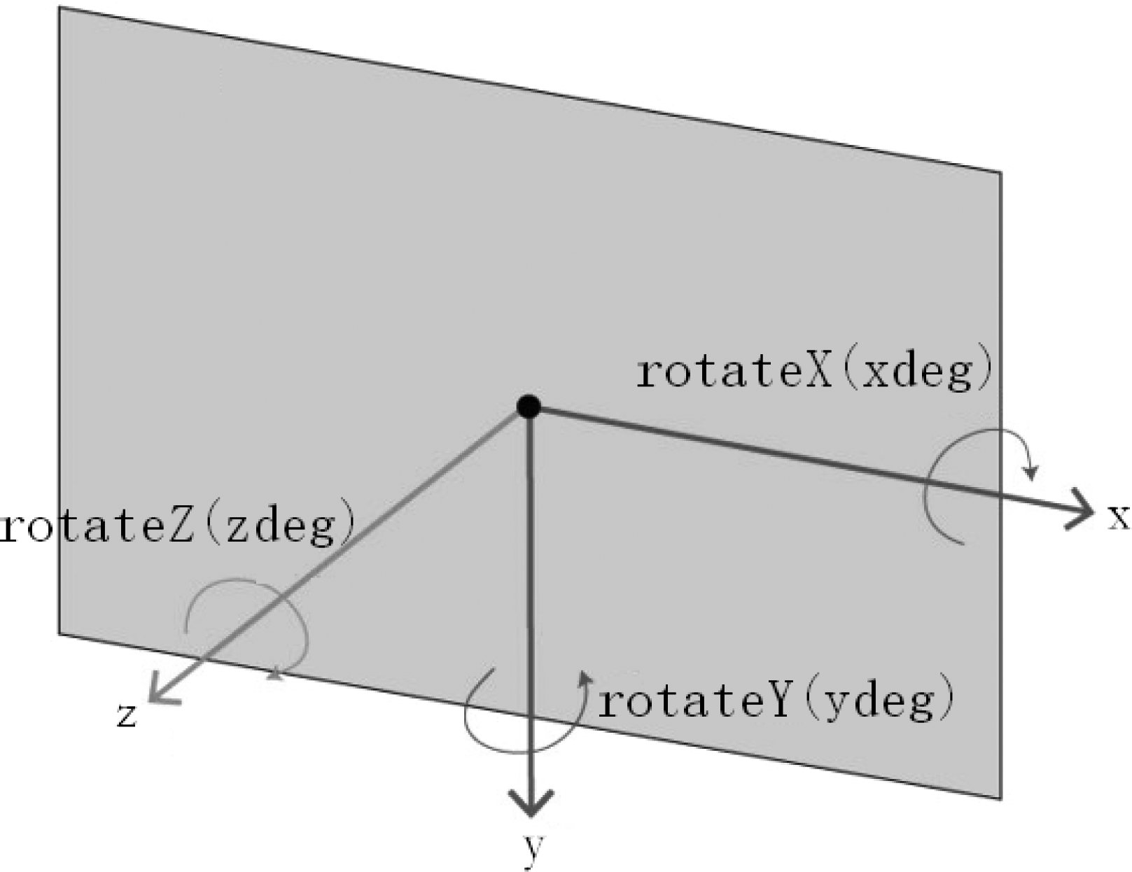 视距调整好后,就可以执行3D旋转了。设置元素的transform属性时,执行rotate系列函数,可让元素3D旋转。rotate系列函数包括: