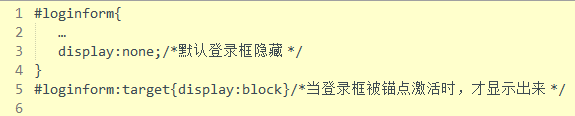 (1)目标伪类,用于突出显示活动的HTML锚点元素,匹配被激活时的锚点目标元素。语法格式为:选择器:target{…},意为当指定“选择器”匹配的元素被锚点激活时所呈现的样式。当希望将页面调转到一个锚点位置时,显示特殊效果,就可用目标伪类。利用目标伪类,同样可以做出有趣的动效,如弹出窗或标签页。下面我们将实验5.4.6中的登录框改为弹出框。HTML代码修改如下: