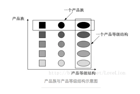 产品族:产品族是对应工厂来说的,一个工厂下面生产的产品等级结构的集合称为产品族。