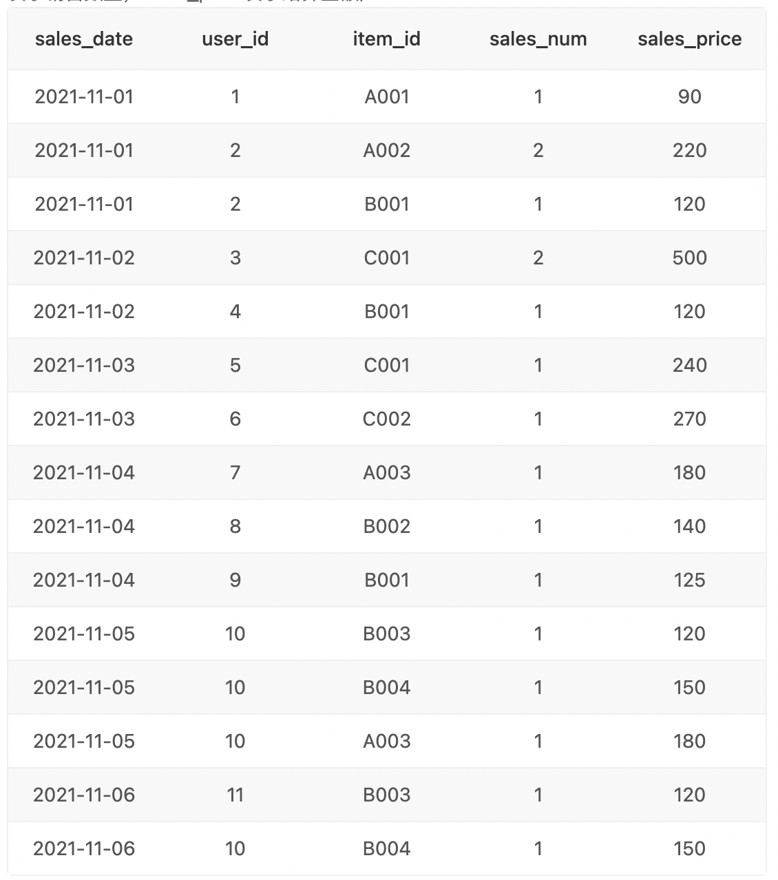 - 使用窗口函数进行排名编号时,对于10号用户,我们想得到给所有的2021-11-05并列排名为1,2021-11-06排名为2,而不是4,所以要用dense_rank而不是rank或row_number。