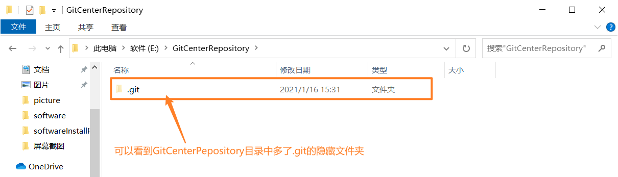 进入GitCenterRepository目录下,看到.git的隐藏文件夹,这个目录是Git来跟踪管理版本的,不要动它。