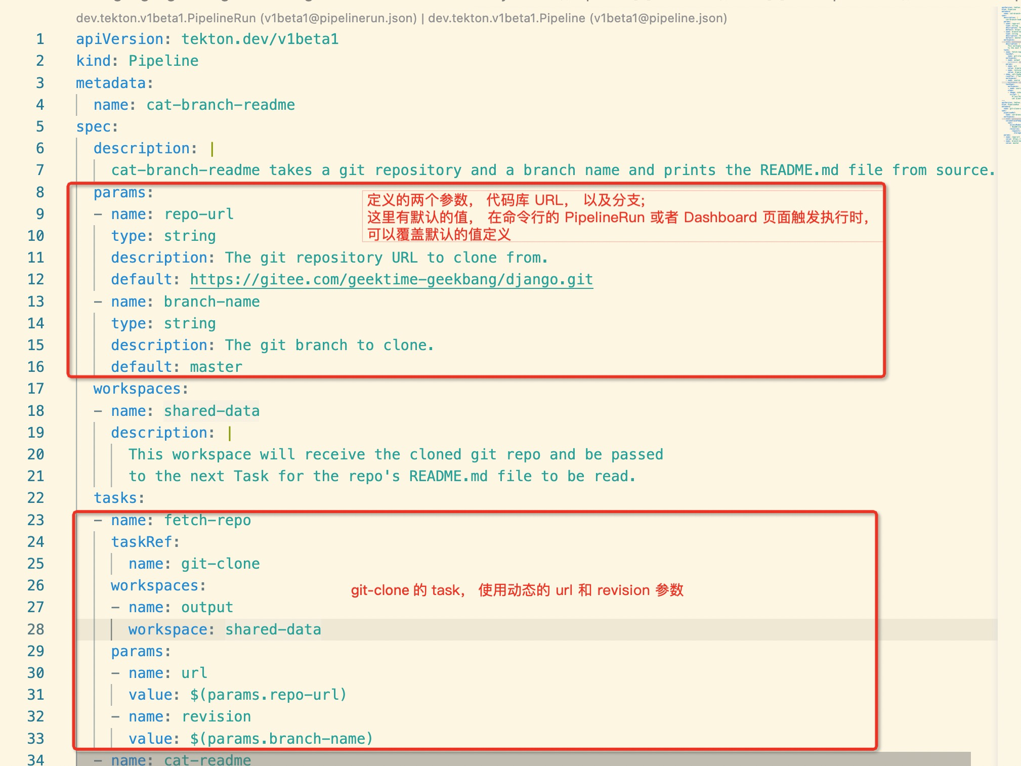 前面一篇博文第四节 “四、创建一个 Pipeline, 包含 git-clone, 并且显示出代码库的 README.md 文件内容” 中有示例:Tekton之二:如何使用 Tekton 创建一个任务和流水线 Pipeline 来获取 Git 代码_davidullua的博客-CSDN博客