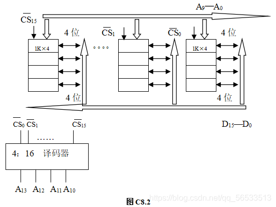 (2)存储器容量为16K,故地址线总数为14位(A13─A0),其中A13A12A11A10通过 4:16译码器产生片选信号CS0─CS15 。