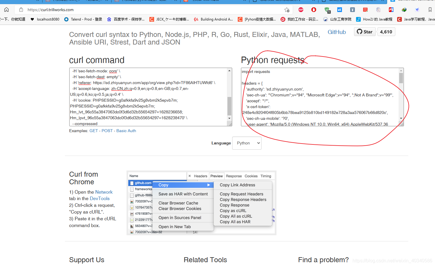 把这个贴进去 生成请求的网页,就可以得到python的请求代码。