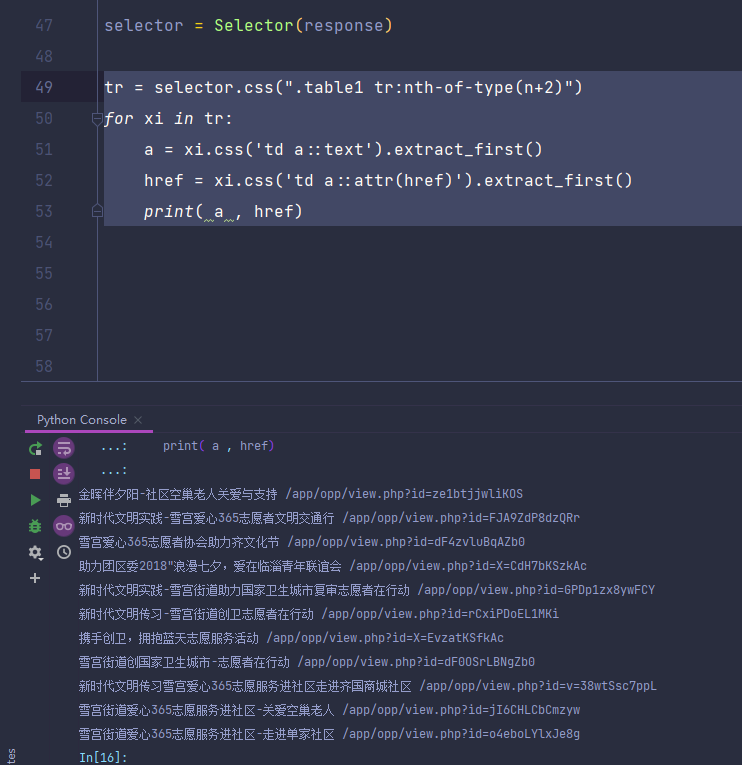 这时,我想要的就是表单里的信息,不想要表头,所以我用css选择器,选择从tr开始,tr里面,第一栏的tr是表头,所以不要表头,用