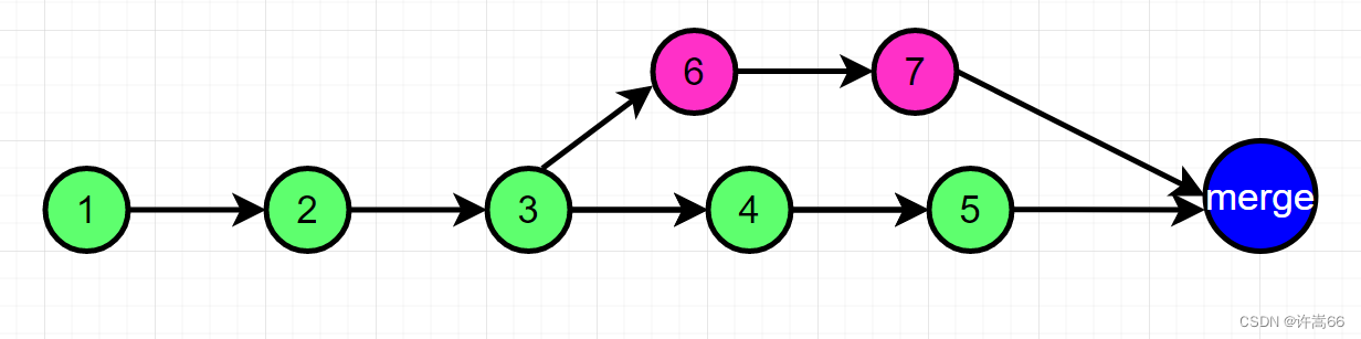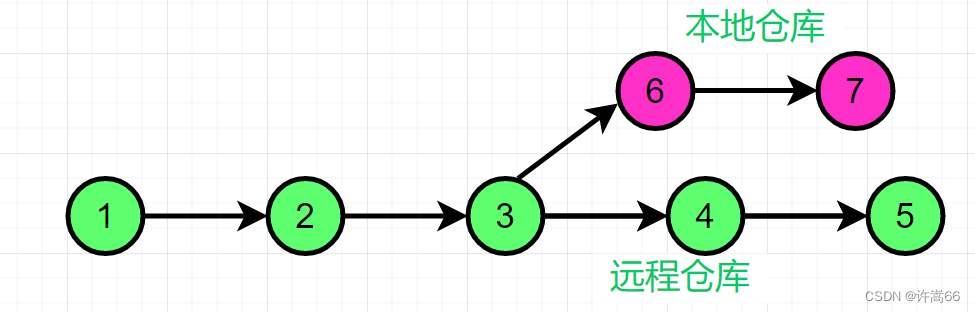 这种问题主要是由于远程仓库有人添加了新的提交,但是本地你自己有增加了新的提交,两者中间处在了冲突,就如下图再第3个版本之后远程仓库别人提交4,5版本,而本地有增加了6,7版本因此push操作就会存在问题。