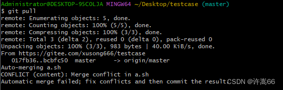 既然是本地仓库版本与远程仓库版本不一致,因此我们可以将本地版本号移动至与远程仓库共同的父节点,也就是图一中3号节点,但是我们的最近的修改有需要保存下来,因此我们可以使用git reset commit_3该操作会将本地的版本号恢复至commit_3的版本,我们先使用git stash 操作将本地的更改存入本地栈,然后执行git pull,之后再使用git stash pop 或者git stash apply stash@{0}将原先本地的修改恢复到现在的最新版本之后,如果出现图4所示的错误,说明我们恢复出来的更改与pull下来远程仓库最新更新发生在同文件同一行,我们修改后确保a.sh文件无误后,依次执行 git add ,git commit ,git push即可成功将本地更改上传到远程仓库。