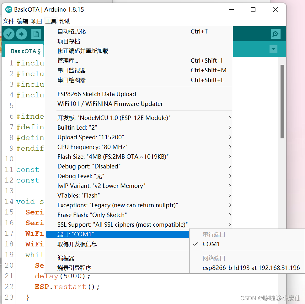 然后点击网络端口,把esp8266通电,可以不插到电脑上,就可以上传程序。
