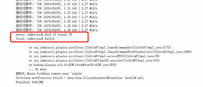场景描述:通过Jenkins 构建项目时,报错error: index-pack died of signal 15