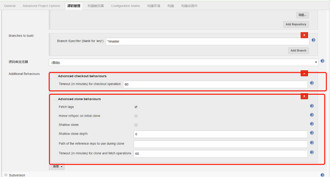 2.在源码管理的Additional Behaviours 点击新增框选择Advanced checkout behaviours和Advanced clone behaviours,分别都在TimeOut后边的输入框内写入时间,这个时间就是clone时最长的时间上限,我这里写的是60(就是60分钟),保存后重新构建即可,最后构建成功了,小伙伴们加油!!!