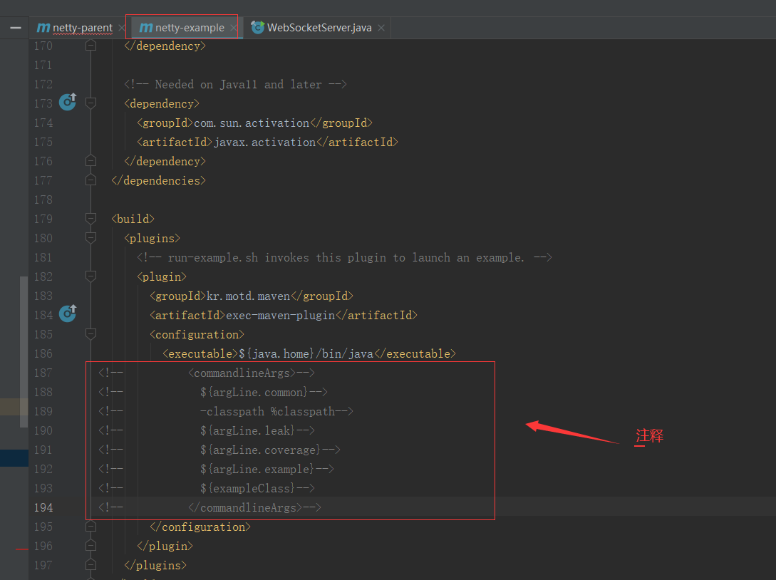 注释 netty-example.pom下的exec-maven-plugin插件配置下的command附加指令(1.8以上用不到)