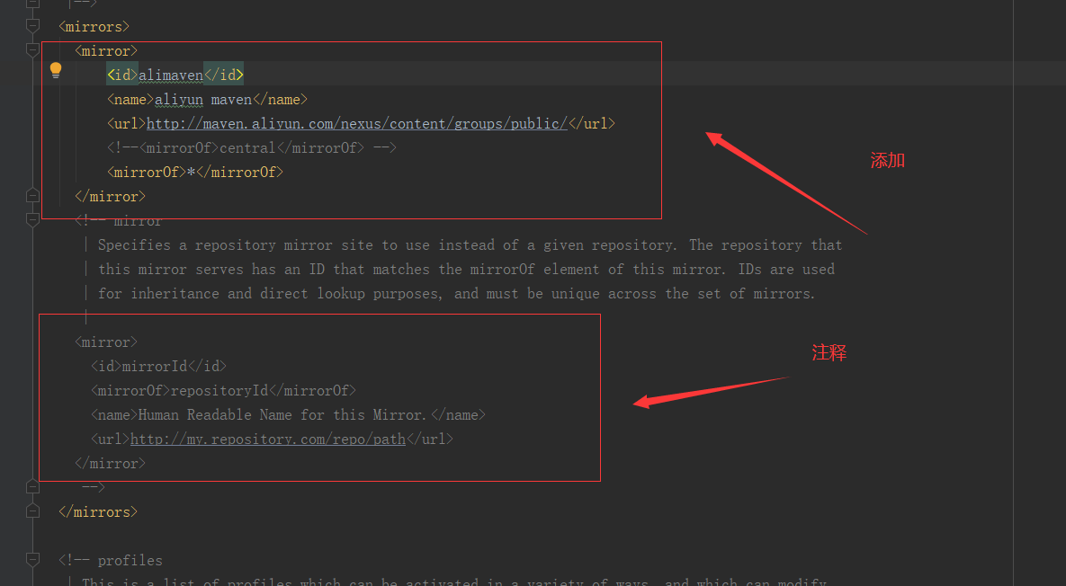 <mirror> <id>alimaven</id> <name>aliyun maven</name> <url>http://maven.aliyun.com/nexus/content/groups/public/</url> <mirrorOf>*</mirrorOf> </mirror>