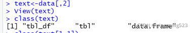 3将data数据框中的第二列赋值命名为text,并查看text的数据类型为data.frame