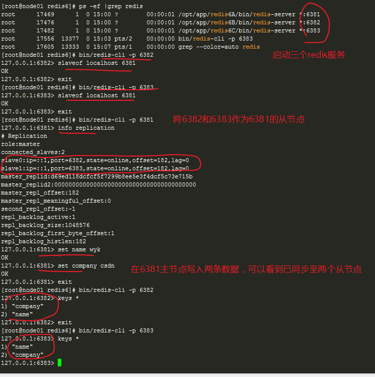 我这里演示在一台机器上启动3个Redis服务以及3个哨兵服务,其中3个redis服务作一主两从,哨兵监控主节点,然后测试主节点挂了之后哨兵自动选举新的master节点。[实际应用中建议分别部署在不同的机器上]:
