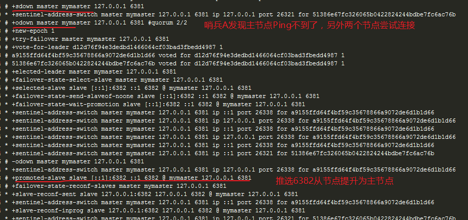 - 自动故障转移:当监控到主节点宕机后,断开与宕机主节点连接的所有从节点,然后在从节点中选取一个作为主节点,将其他的从节点连接到这个最新的主节点。最后通知客户端最新的服务器地址。