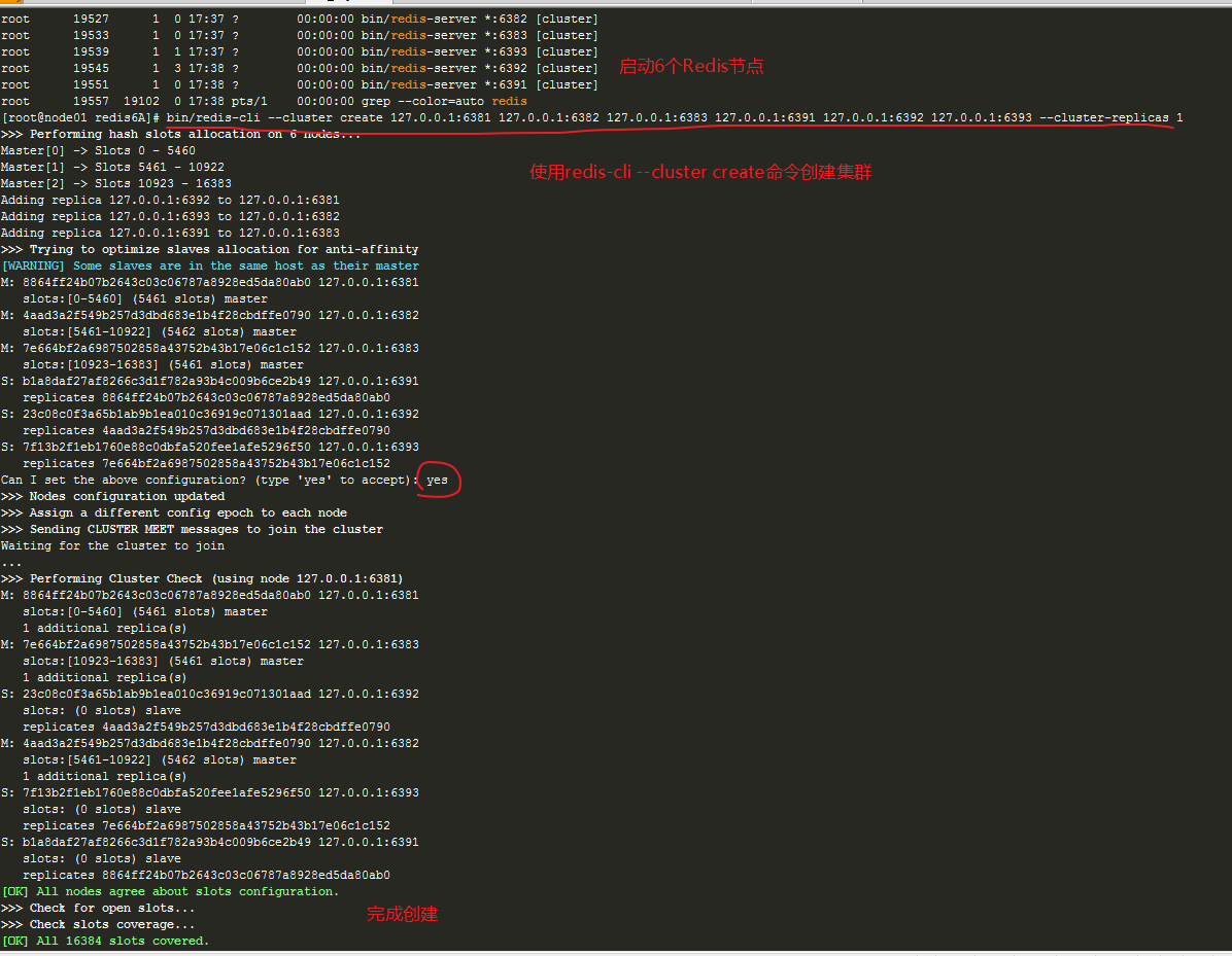 部署集群需要先启动各个节点的服务,此时这些节点都没加到集群中,使用redis-cli --cluster create xxx命令创建集群: