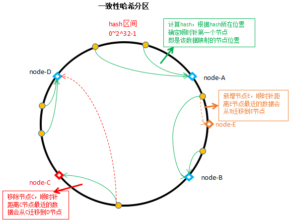 将hash值区间抽象为一个环形,节点均匀分布在该环形之上,然后根据数据的key计算hash值,在该hash值所在的圆环上的位置延顺时针行走找到的第一个节点的位置,该数据就放在该节点之上。相比于哈希取余,一致性哈希分区将增减节点的影响限制为相邻节点。