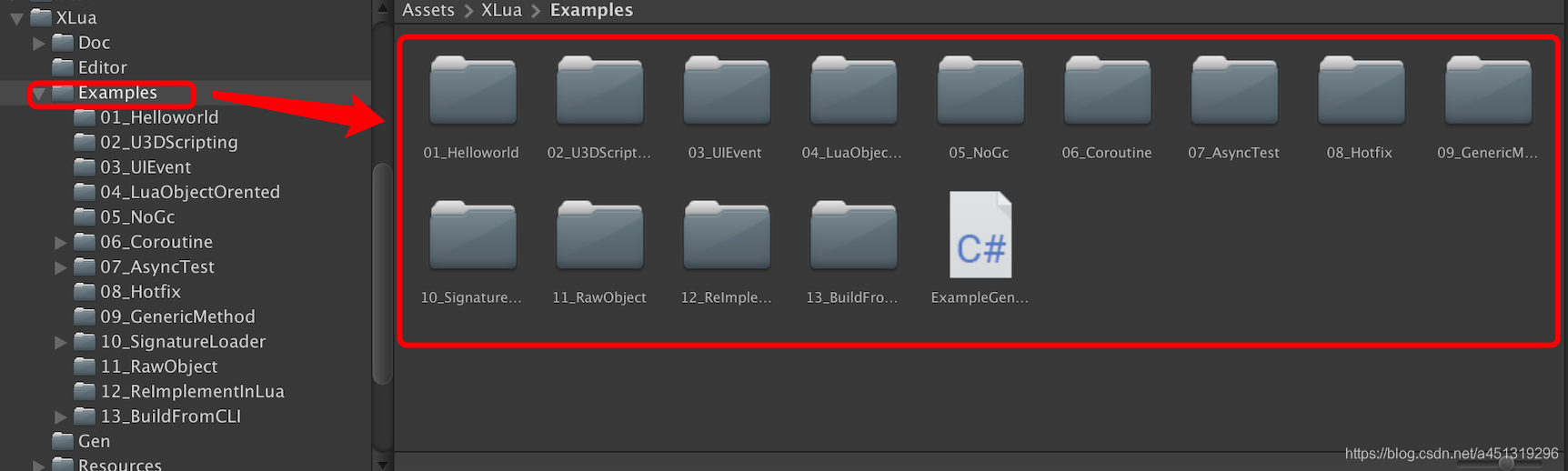 3. “Assets/XLua/Examples” 目录中,存放着腾讯给我们提供的示例工程