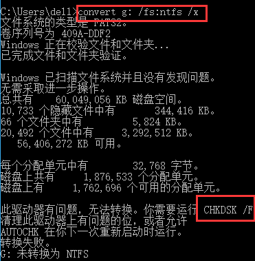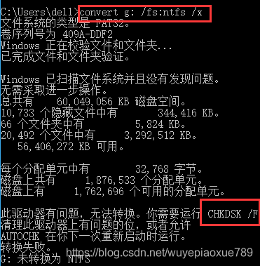 2、出现提示,再运行 chkdsk g: /f,g为盘符,最后运行convert g: /fs:ntfs /x 即可.