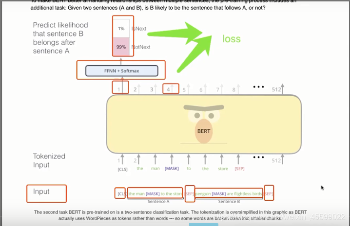 bert:两个句子如果相连则输出0,不相连则输出1,然后将所有句子两两组合输入模型,开头加【cls】第一句【sep】第二句【sep】损失函数为mask单词和句子间关系损失之和。