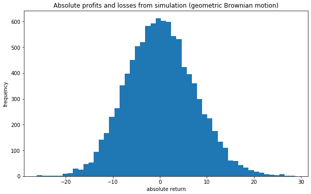 plt.title("Absolute profits and losses from simulation (geometric Brownian motion)")