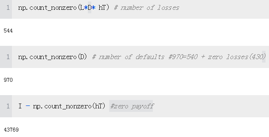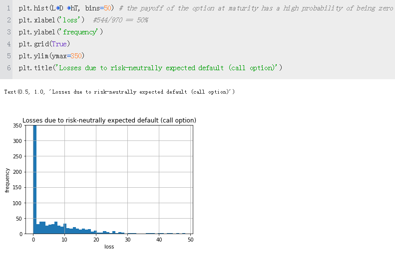 In this particular simulation example, we observe roughly 1,000 losses due to credit risk, which is to be expected given the assumed default probability of 1%(p = 0.01 #Defines the probability of default.) and 100,000 simulated paths: