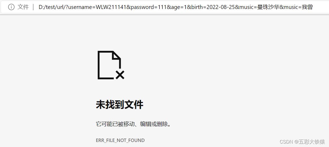 由于我们这边没有涉及到数据的存储,即( <form action="/test/url/">)是不存在的,所以当我们点击完注册登入后,就会出现如下图的报错情况。但是我们可以在网页链接那里看到我们注册界面的一系列信息。