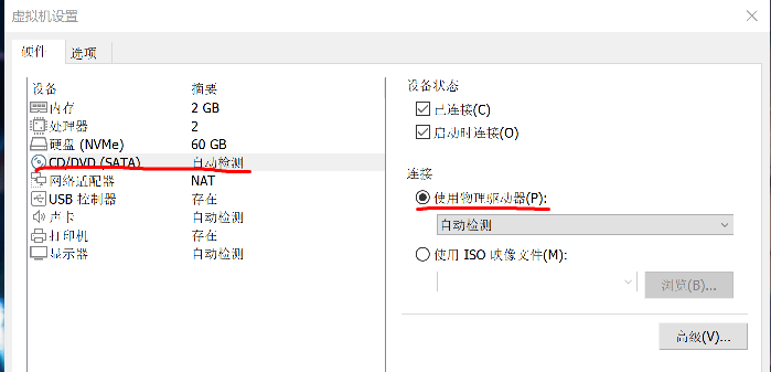 找到CD/DVD,改成“使用物理驱动器”,点击确定生效?