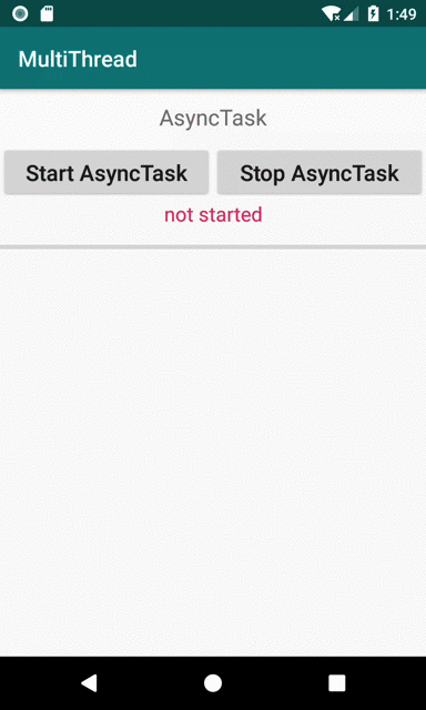 点击 Start AsyncTask 按钮,开始执行异步任务,点击 Stop AsyncTask 按钮,取消任务执行。效果如下所示: