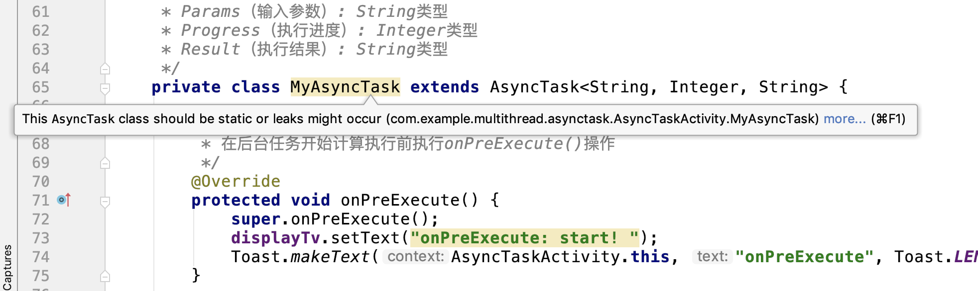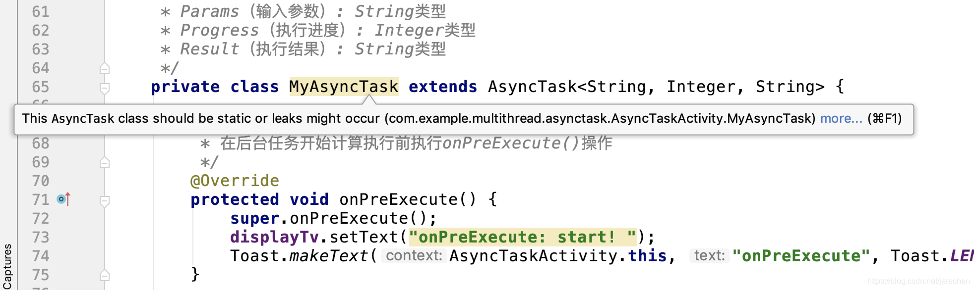 This AsyncTask class should be static or leaks might occur (这个AsyncTask类应该是静态的,否则可能会发生泄漏),解决的方法呢,就是将该内部类写成静态的内部类,然后对 Activity(或者的需要的 Context)采用 WeakReference 弱引用, 方法如下所示: