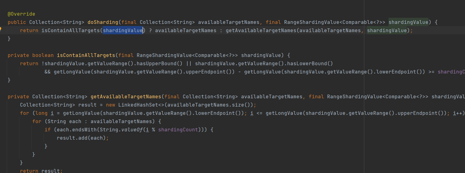 4. 范围查询分片doSharding(final Collection<String> availableTargetNames, final RangeShardingValue<Comparable<?>> shardingValue)