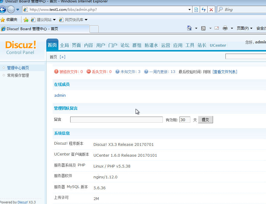访问www.test1.com/bbs/admin.php 登录到后台看看: