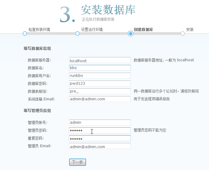 mysql> grant all on bbs.* to runbbs@localhost identified by ‘pwd123’; // 设置权限