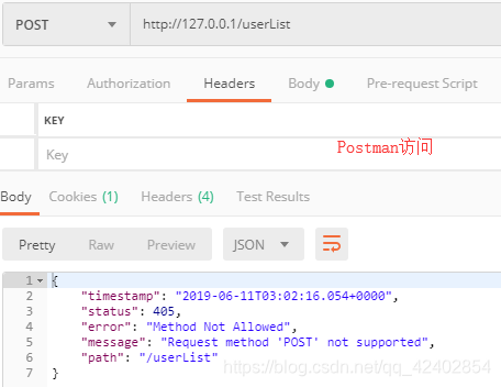 如果没有进行处理出现错误,如果是浏览器访问,它会返回一张 html 的错误页面,如果是其他客户端访问出现异常,它会直接返回json格式的异常数据。